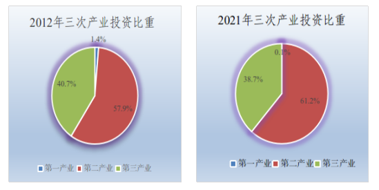 十年来,投资动能不断向产业实体转移。我市持续扩大有效投资,不断推进投资动能向民间、实体产业转移。全市固定资产投资累计突破2400亿元大关,比上一个十年增长99.6%。我市始终坚持项目“第一抓手”,聚力招商引资,建设培育优质项目,2021年全市亿元以上项目个数达到117个(含房地产)。全市三次产业投资比重由2012年的1.4:57.9:40.7调整为2021年的0.1:61.2:38.7,第二产业提高3.3个百分点,产业整体投资结构继续保持“二三一”的发展格局,三次产业投资比重持续调整。第二产业基础得到加强,2021年第二产业投资同比增长40.9 %,比十年前增长14.4个百分点,拉动全部投资增长19.6个百分点。2021年,民间投资同比增长25.1%,快于全部投资增速15.1个百分点,占全部投资的67.4 %。