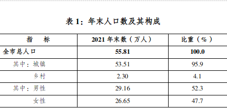 年末全市常住总人口55.81万人,比上年增加0.13万人,其中城镇人口53.51万人,乡村人口2.30万人,常住人口城镇化率达95.88%,比上年提高0.51个百分点。男性人口29.16万人,女性人口26.65万人。人口出生率7.01‰,人口死亡率6.41‰,人口自然增长率0.6‰。