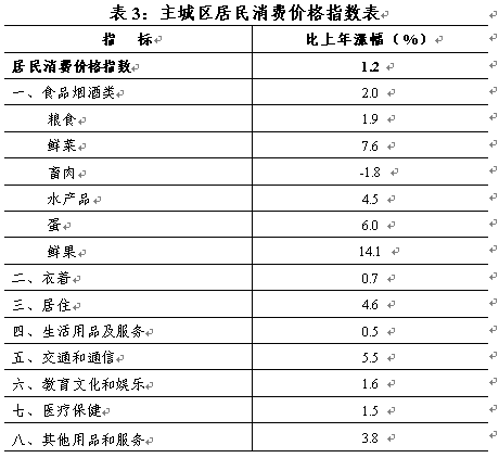 主城区居民消费价格上涨1.2%。其中:食品烟酒类价格上涨2.0%,交通和通信类价格上涨5.5%,医疗保健类价格上涨1.5%,衣着类价格上涨0.7%,居住类价格下降4.6%,生活用品及服务类价格上涨0.5%,教育文化和娱乐类价格上涨1.6%,其他用品和服务类价格上涨3.8%。