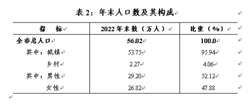 年末常住总人口56.02万人,比上年增加0.21万人,其中城镇人口53.75万人,乡村人口2.27万人,常住人口城镇化率达95.94%,比上年提高0.06个百分点。男性人口29.20万人,女性人口26.82万人。全年出生人口0.38万人,人口出生率6.76‰,死亡人口0.39万人,人口死亡率6.97‰。
