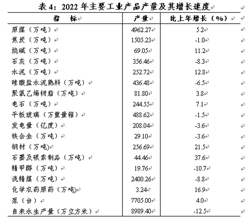 从主要工业产品产量看,原煤产量4962.27万吨,增长5.2%;洗精煤产量2400.26万吨,下降8.8%;钢材产量256.69万吨,增长21.5%;电石产量244.55万吨,增长7.1%;水泥产量252.72万吨,增长12.8%;平板玻璃产量488.62万重量箱,下降1.5%;焦炭产量1505.23万吨,下降1.0%;发电量208.04亿千瓦时,下降3.6%。